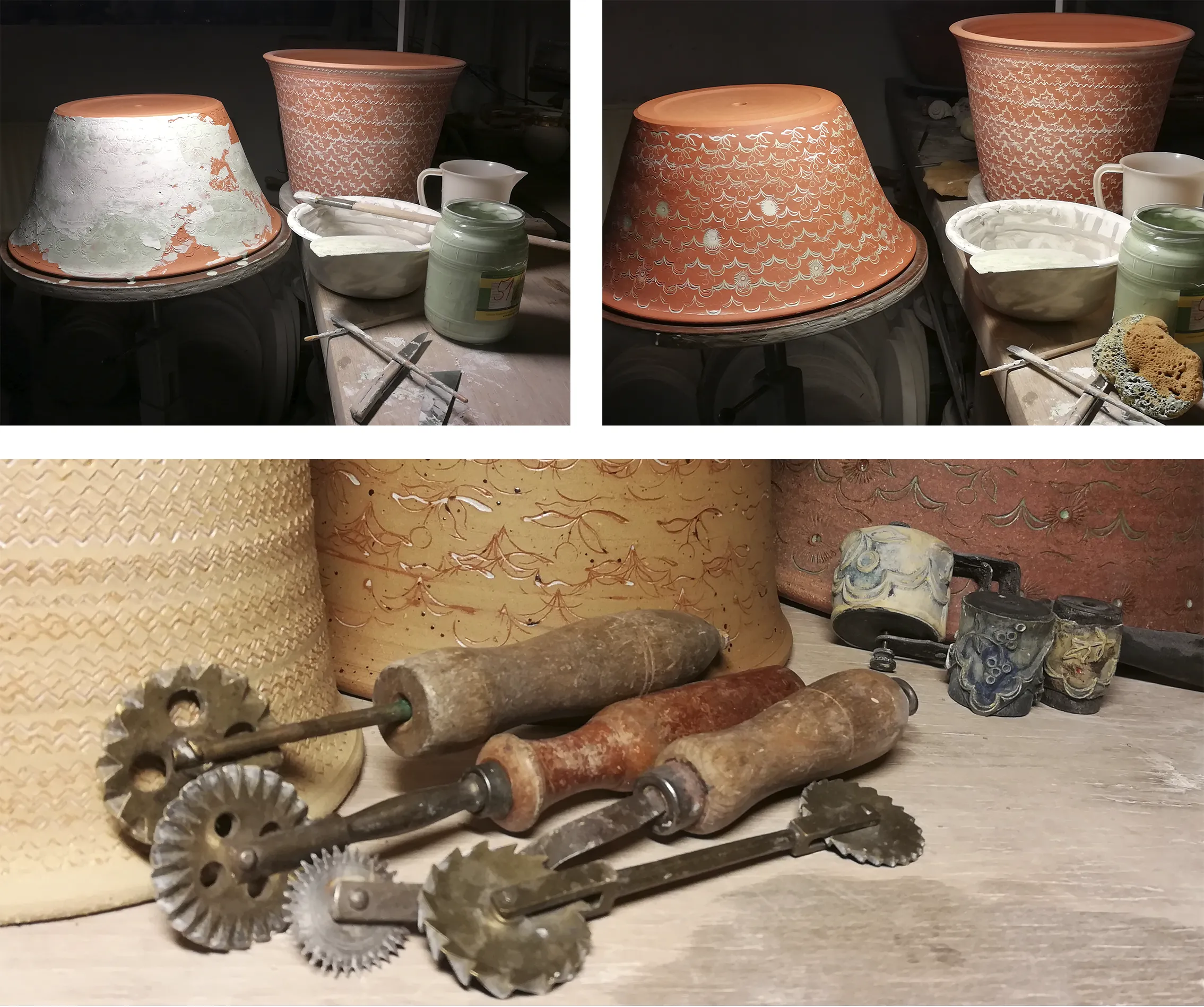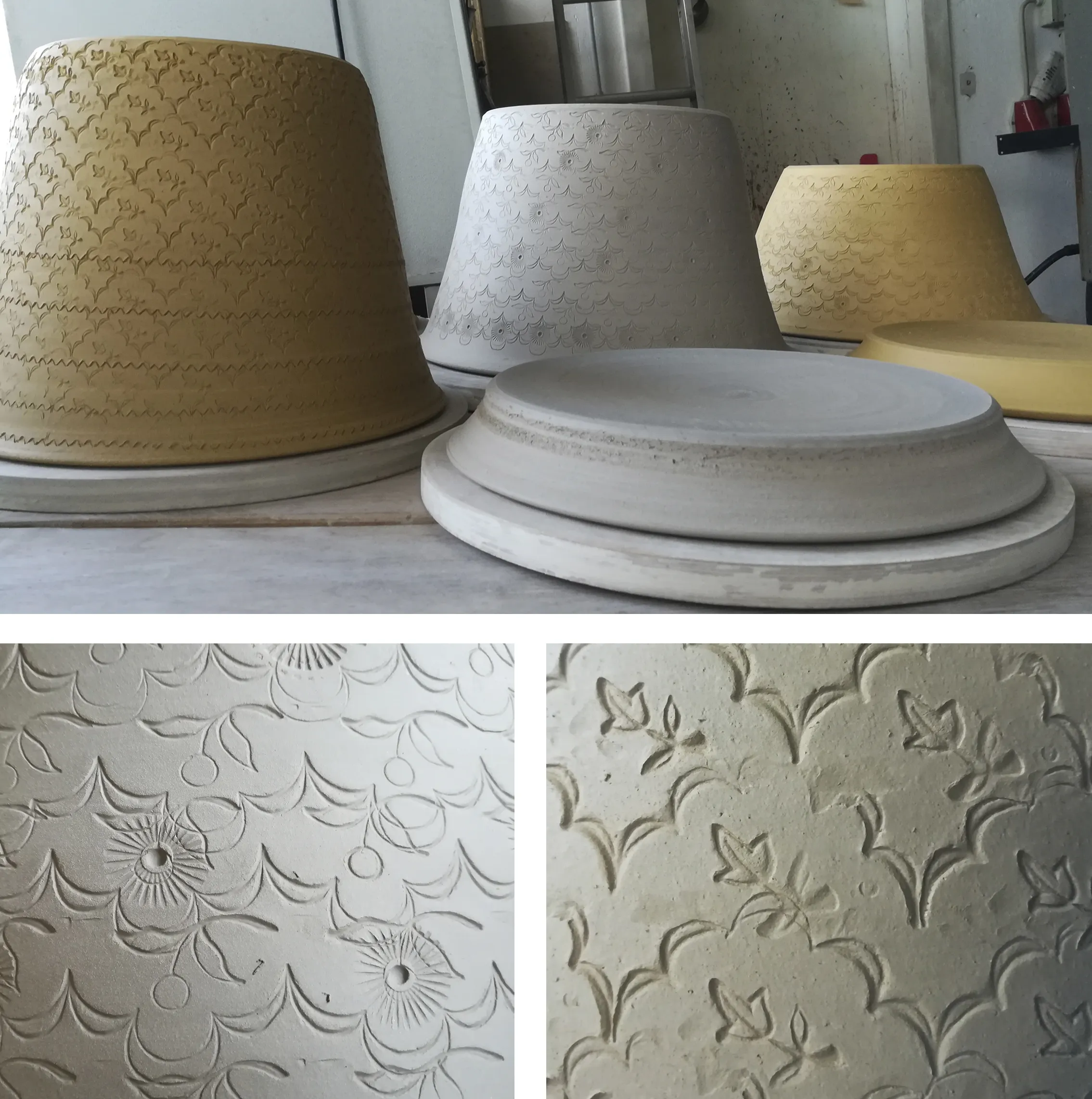 Hier in meiner Werkstatt entsteht hochgebrannte Gefäßkeramik aus Westerwälder Steinzeugton, sowie zweiseitig gemusterte Bisquitporzellanhänger aus feinster Porzellanmasse.
